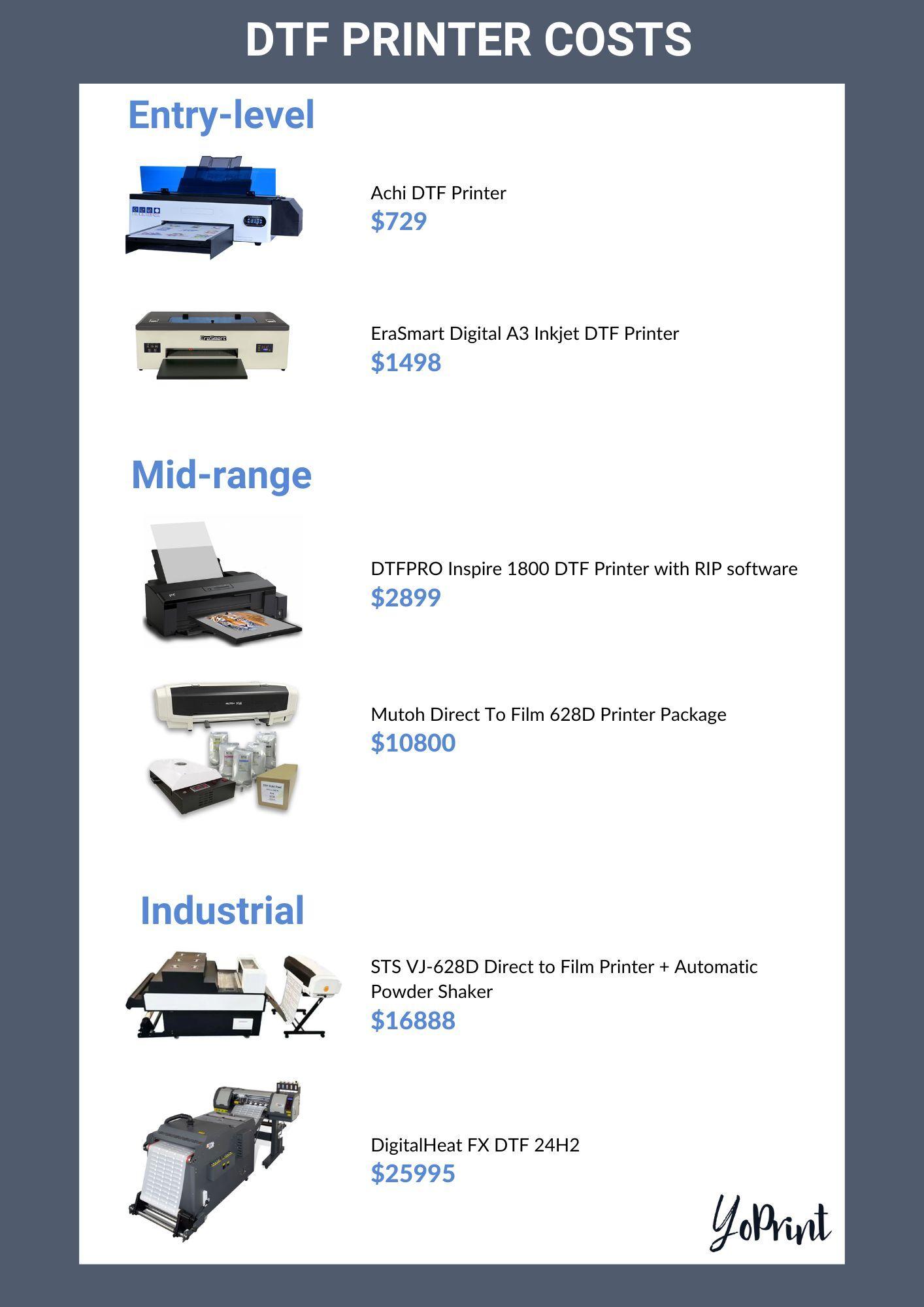 For larger industrial-level setups, you can purchase a complete DTF printing machine with built-in automated systems (like the DigitalHeat FX DTF 24H2 printer) for upwards of $15,000 or higher. You can even find mid-range printer packages going for $10,000 and above if you’re lucky.