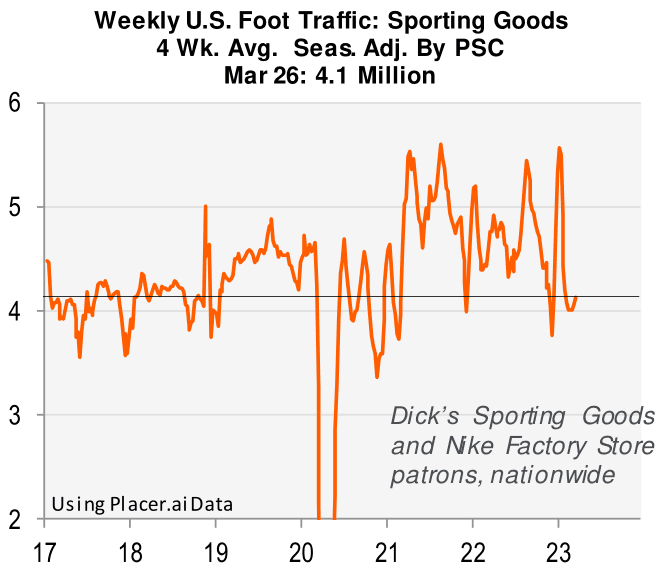 - Consumer spending is still going strong, particularly on leisure, travel, and activewear; footwear is a big hit in the sporting goods segment