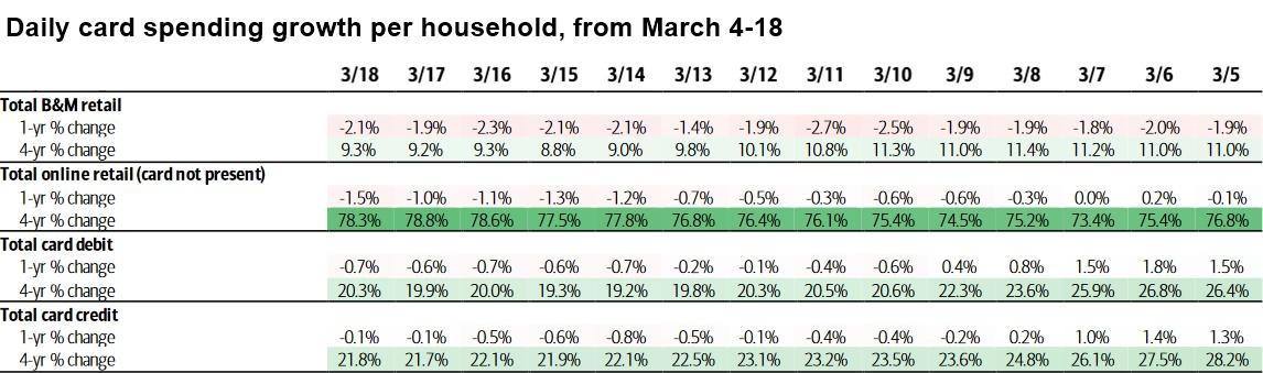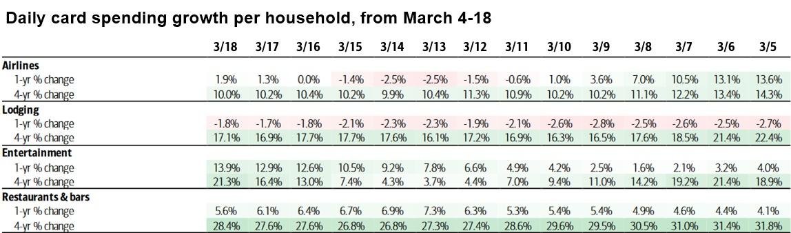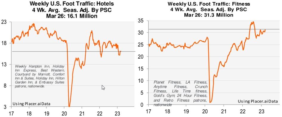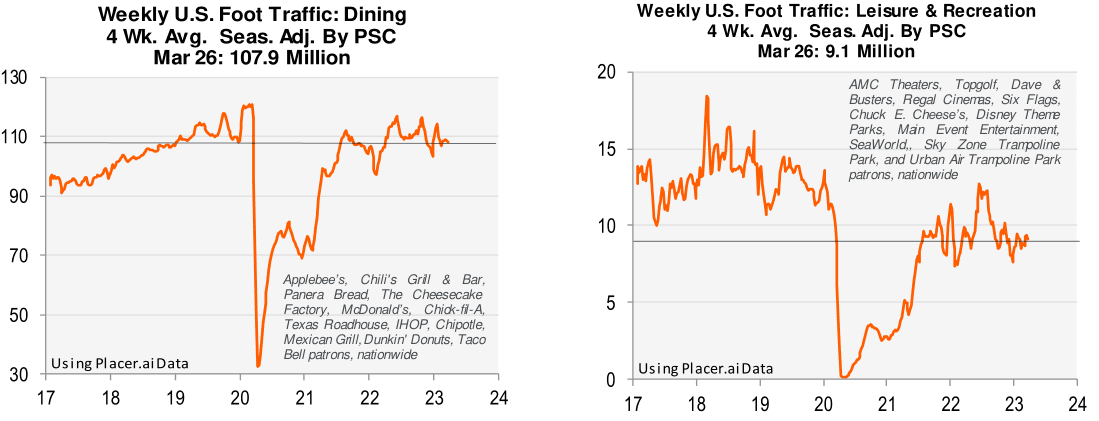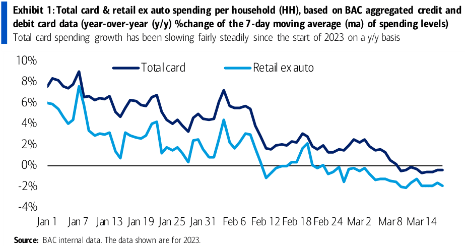 In our previous report, we noted that consumers are still going out and spending on food and events as summer approaches. This has stayed the same for the most part since then, although total card spending per household did fall 0.4 percent year-on-year in the week ending March 18th. In fact, card spending has started slowing as early as January; however, it’s not been significantly impacted by regional bank stresses.