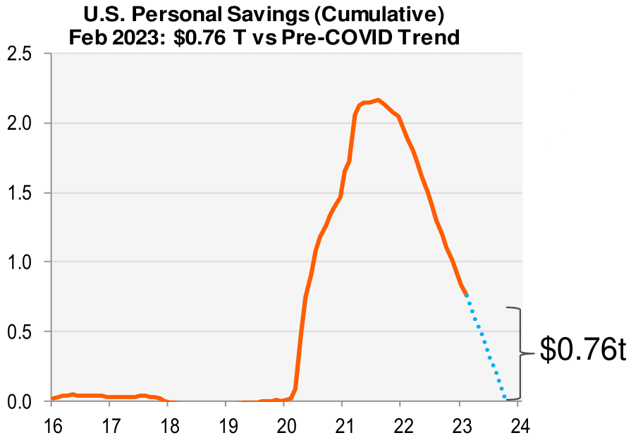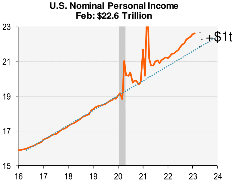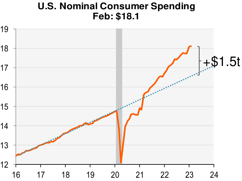 Consumers still have spending power, especially as “nominal income growth is still $1t above its pre-Covid trend” thanks to job opportunities and better pay. These contribute to an excess in income and savings, allowing nominal consumer spending to continue: it’s now “a massive $1.5t over pre-Covid trend,” as Piper Sandler reports.