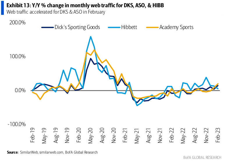 Of interest to your print shop is what consumers have been spending on lately, especially activewear. In fact, Nike’s implied sales at various retailers increased 21 percent year-on-year, with most purchases being footwear. Despite a fall in foot traffic since the fourth quarter of 2022 and a 7.9% month-to-date decline in March, a modest increase in web traffic for sporting goods retailers may have helped retain consumer interest. In the case of Dick’s Sporting Goods (DKS) and Academy Sports + Outdoors (ASO), February web traffic increased by 15 percent and 20.6 percent, respectively.