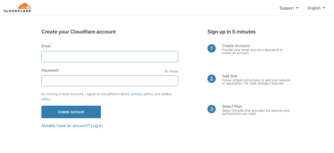 Let’s start by creating a Cloudflare account. Navigate to https://www.cloudflare.com/ and click Sign Up