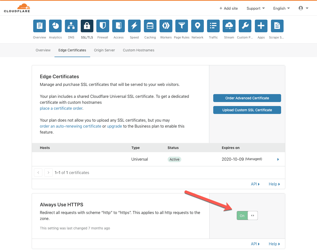 Let’s go to the SSL/TLS tab to turn on HTTPS. Click on Edge Certificates and then enable Alway use HTTPS.