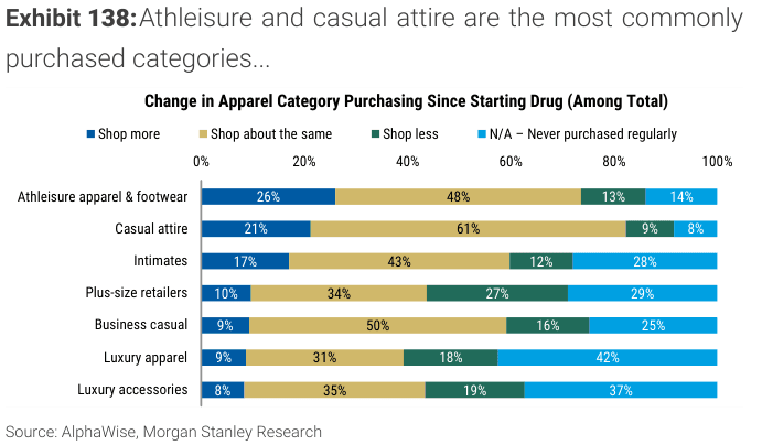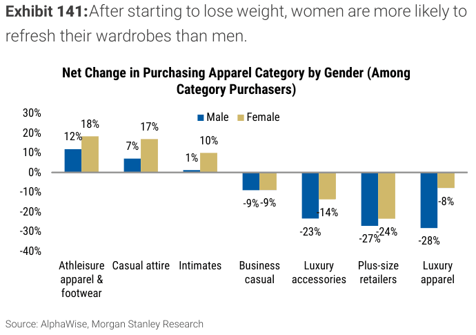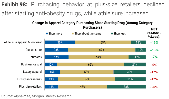 Morgan Stanley foresees a scenario where, by 2035, 20 percent of the 133 million obese Americans will be using AOMs like Ozempic. But things won’t change overnight because of one growing trend; consumer spending on apparel is still low today.