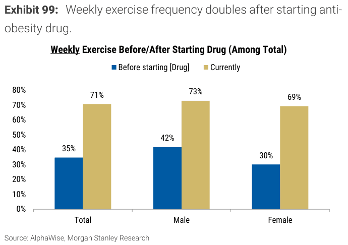 - Gyms are expected to benefit as people on weight loss drugs are more likely to lead an active lifestyle. In a survey by Morgan Stanley, they noted that a majority of respondents exercised more often once they started taking anti-obesity medications (AOMs) like Ozempic. It does seem to imply that it’s not simply a wonder drug and that people are willing to do more to keep their health in check.