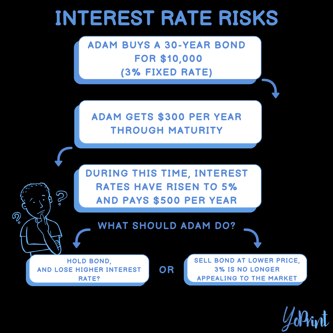 - Let’s put it this way: Suppose an individual purchases a 3% fixed-rate 30-year bond for $10,000. This bond pays $300 per year through maturity. If during this time, interest rates rise to 5%, new bonds issued pay $500 per year through maturity, assuming a $10,000 investment. If the 3% bondholder continues to hold their bond through maturity, they lose out on the opportunity to earn a higher interest rate.