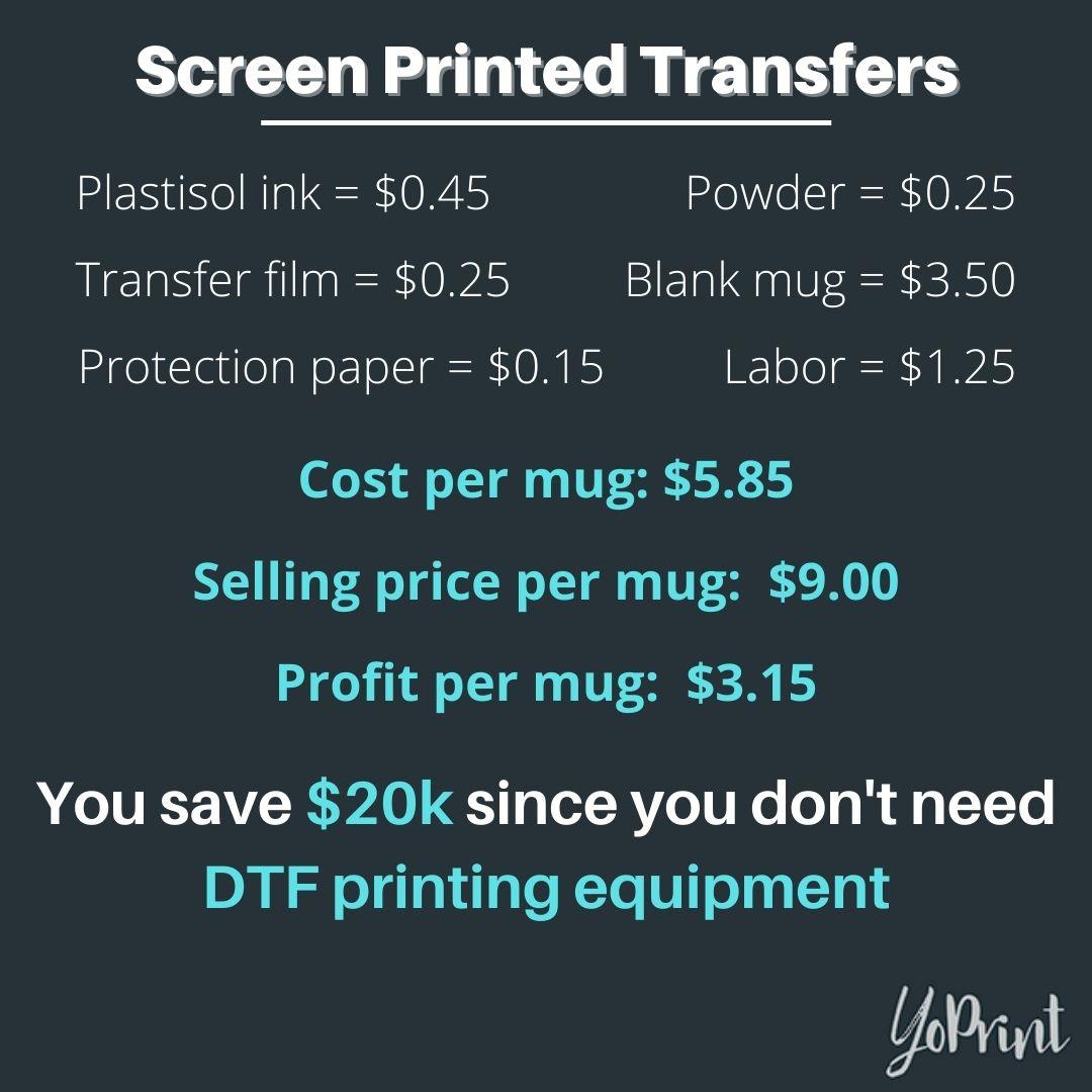 Since screen-printed transfers use the same principles as DTF printing, you won’t need to spend $20,000 on DTF-related equipment. You’ll be able to put that capital to use for other aspects of growing your business.