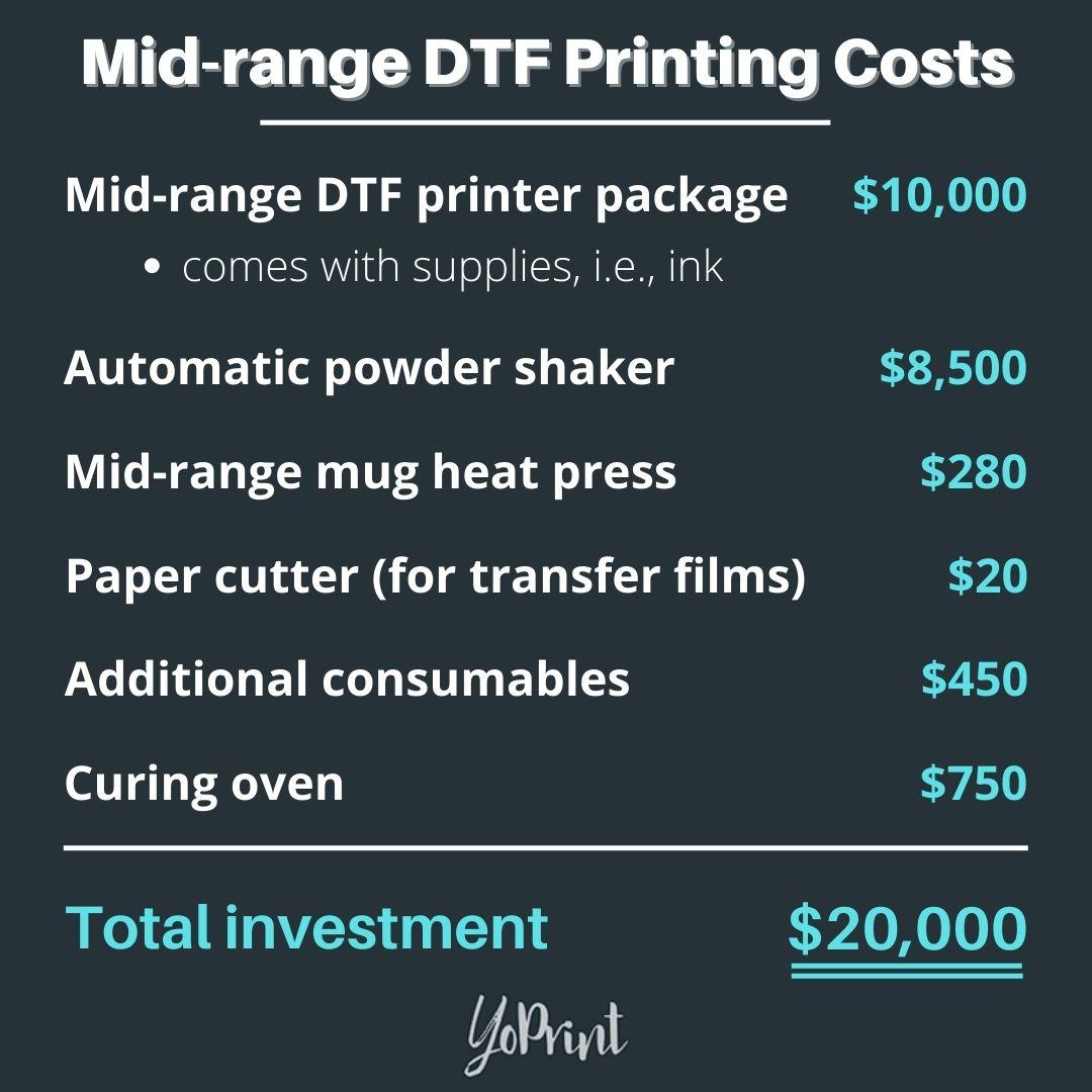 You can easily find affordable DTF starter packages for a decent price point. For $10k, you can get a mid-range DTF printer with a starting batch of supplies, including inks, transfer films, raster image processing (RIP) software, and more.