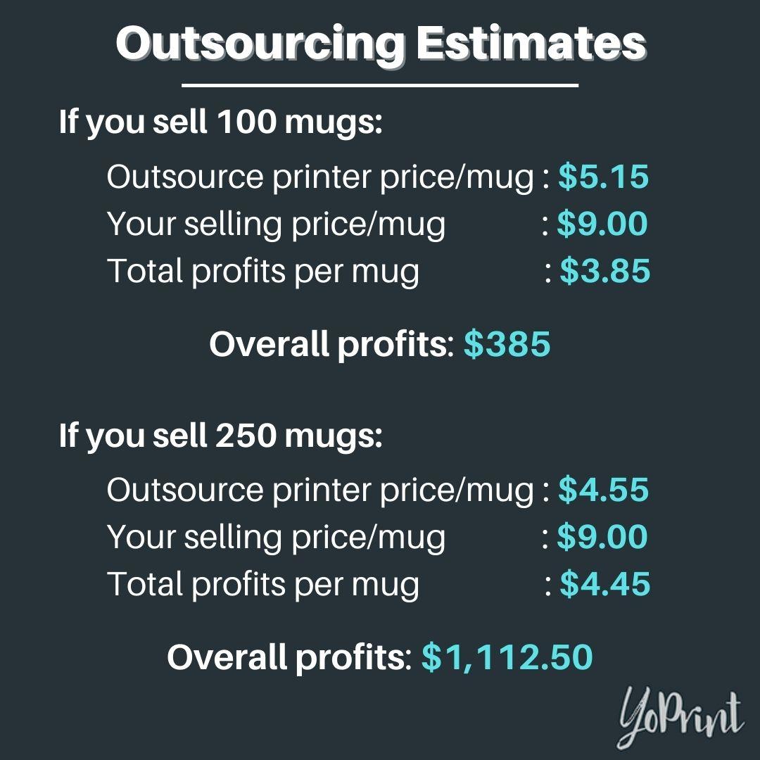 Let’s say you have orders for 12oz mugs. Note how the cost per unit decreases with more items in an order. Your profitability will therefore be affected by how you price your garments and the volume of orders you receive. The example below clearly illustrates this: