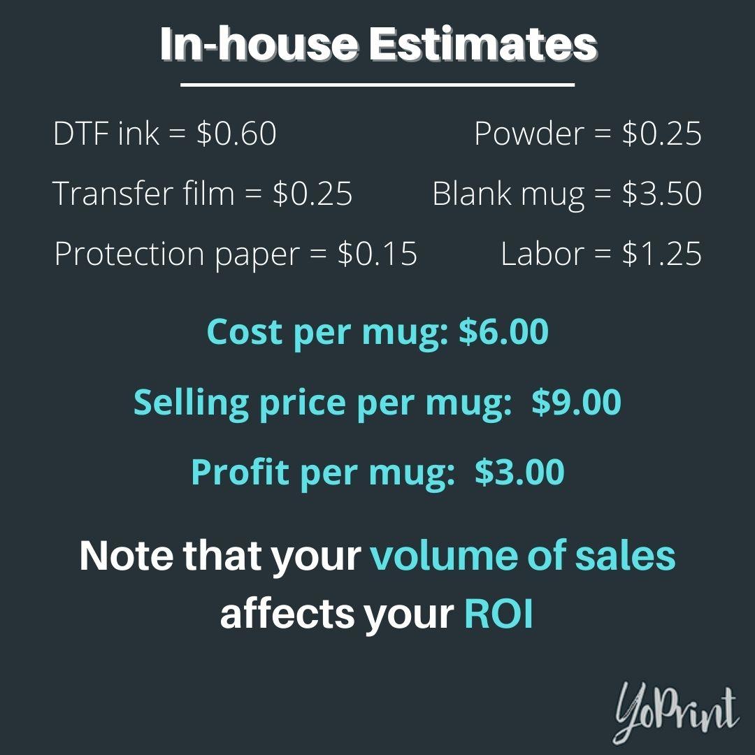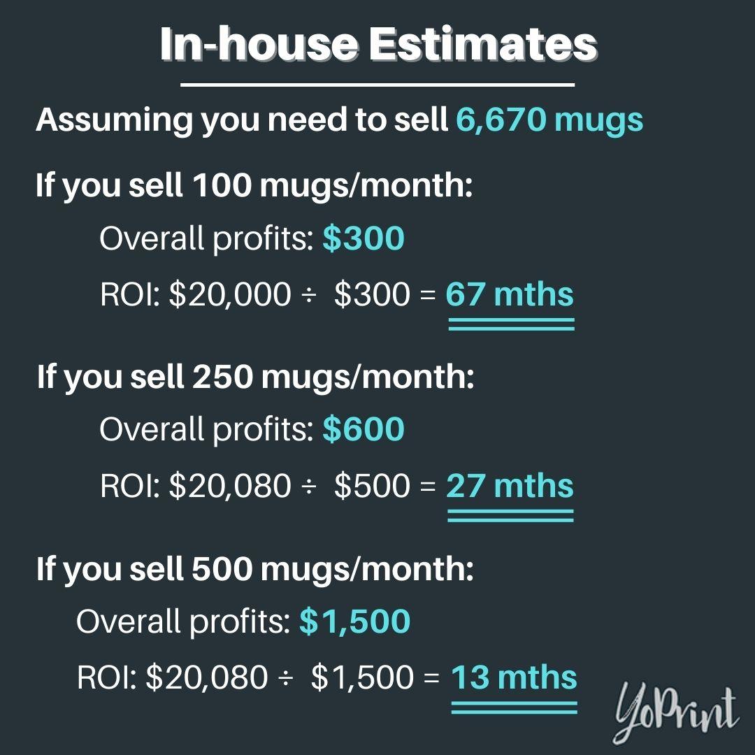 Achieving your ROI for your equipment purchase will depend on how well your sales are doing. Given that you’re making a profit of $3 per mug, you’ll need to sell about 6,670 mugs to achieve your ROI. Remember that the more you can sell, the faster you’ll achieve ROI. The following example will give you a clear picture of what to expect.