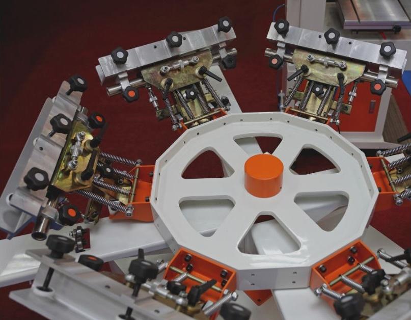 The screen printing press holds your screens and substrates in place, allowing you to print your design on the substrate. Most presses take on the form of a thick countertop stand with a ring of multiple platens (to mount the substrates) and hinge clamps with swivels (to hold the screens and position them over the substrate).