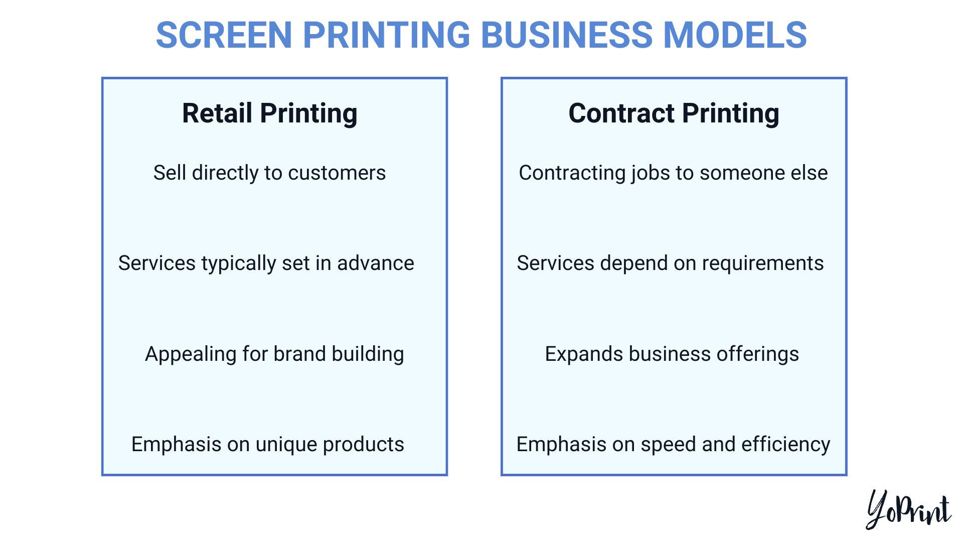 Retail printing is appealing if you want to build a brand. By offering customers options for what they want, you can price your garments accordingly for various available services. You can easily mark up prices for each service you offer. Contract printing, on the other hand, emphasizes speed and efficiency. Your customer tells you what they need and when they need it, and you’ll fulfill their request within the specified timeframe.
