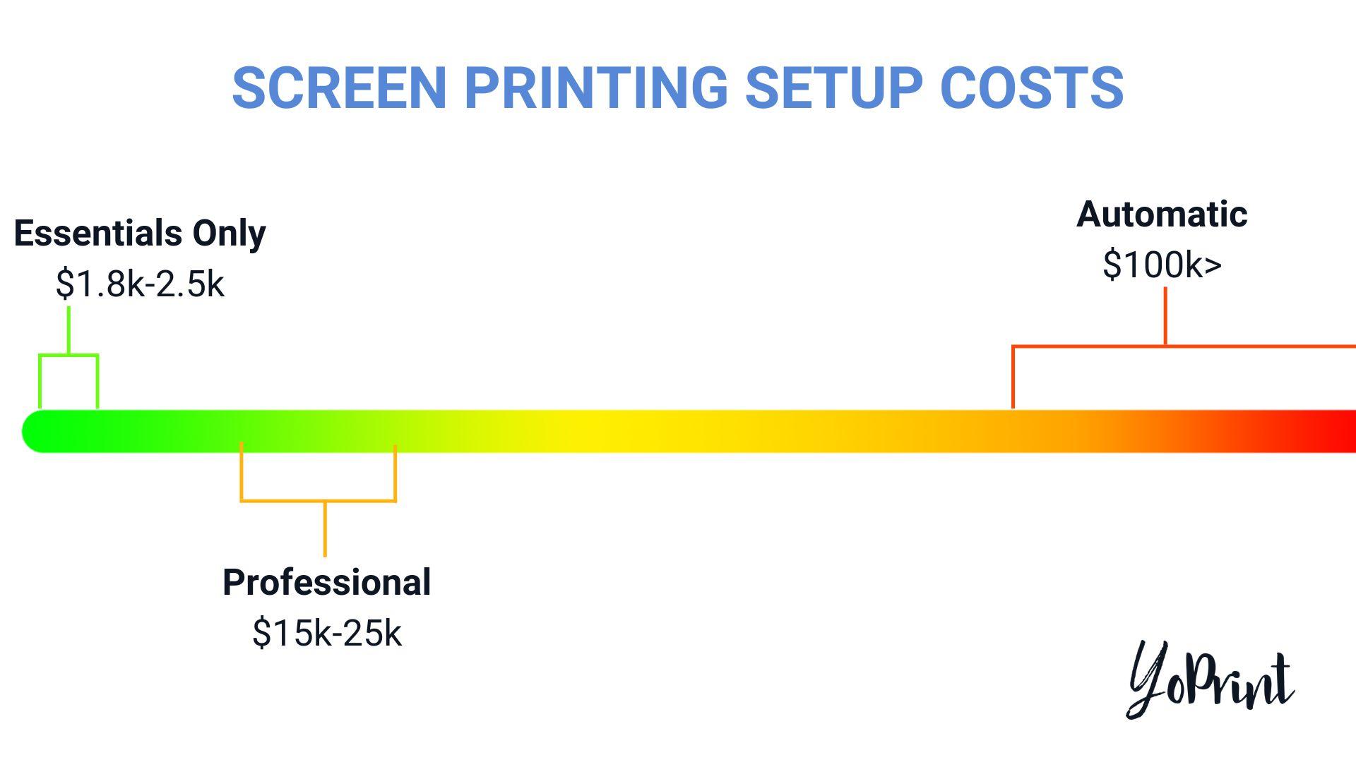 A complete setup may cost you anywhere from $20,000 and above, depending on what brands you purchase. Again, ScreenPrinting.com has a decent deal for a complete set going for $21,995 (offer price). Other equipment can be added where needed.