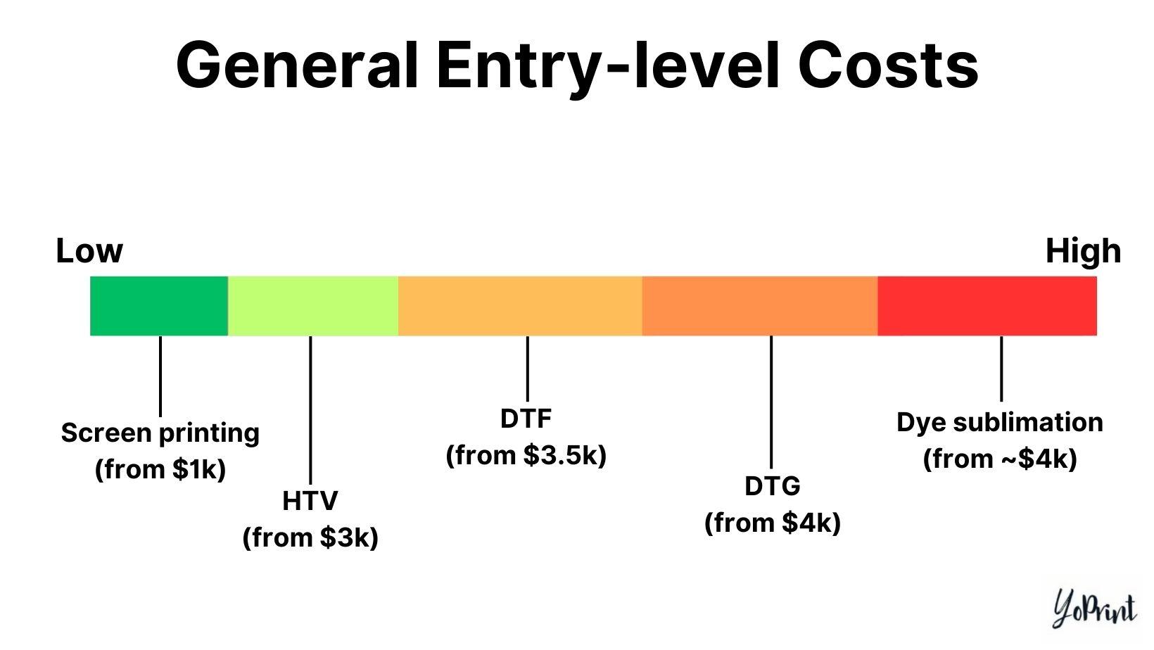 The closest that compares to HTV’s low entry cost is screen printing: a simple 4-color single station with a flash dryer, an exposure unit, and starting supplies with ink and emulsions can go for only $2,000 – just double what HTV needs.