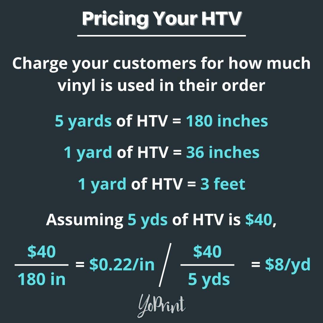 This formula will be beneficial to help you plot out how much you should charge your customers for the amount of vinyl needed in their order. If an order only needs 24 feet of vinyl, that’s a sum of $5.28. But you’re not only charging them on the vinyl alone; your cost of goods (such as the garment) will also be a part of the calculation.