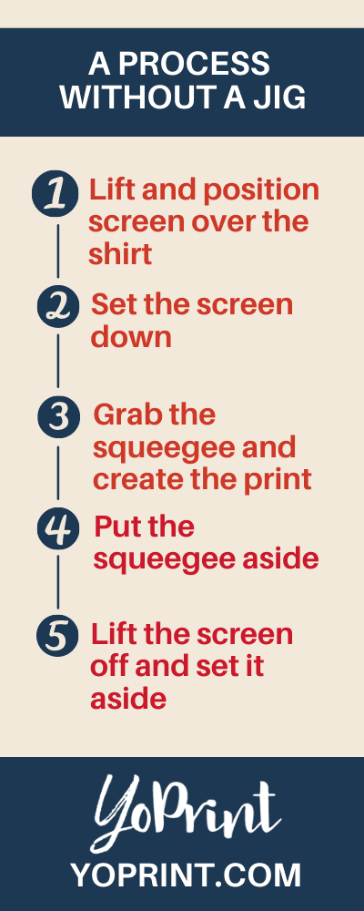 A jig will hold the screen above the T-shirt, and then lower it into the correct position when you are ready to apply the print.