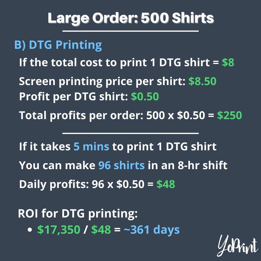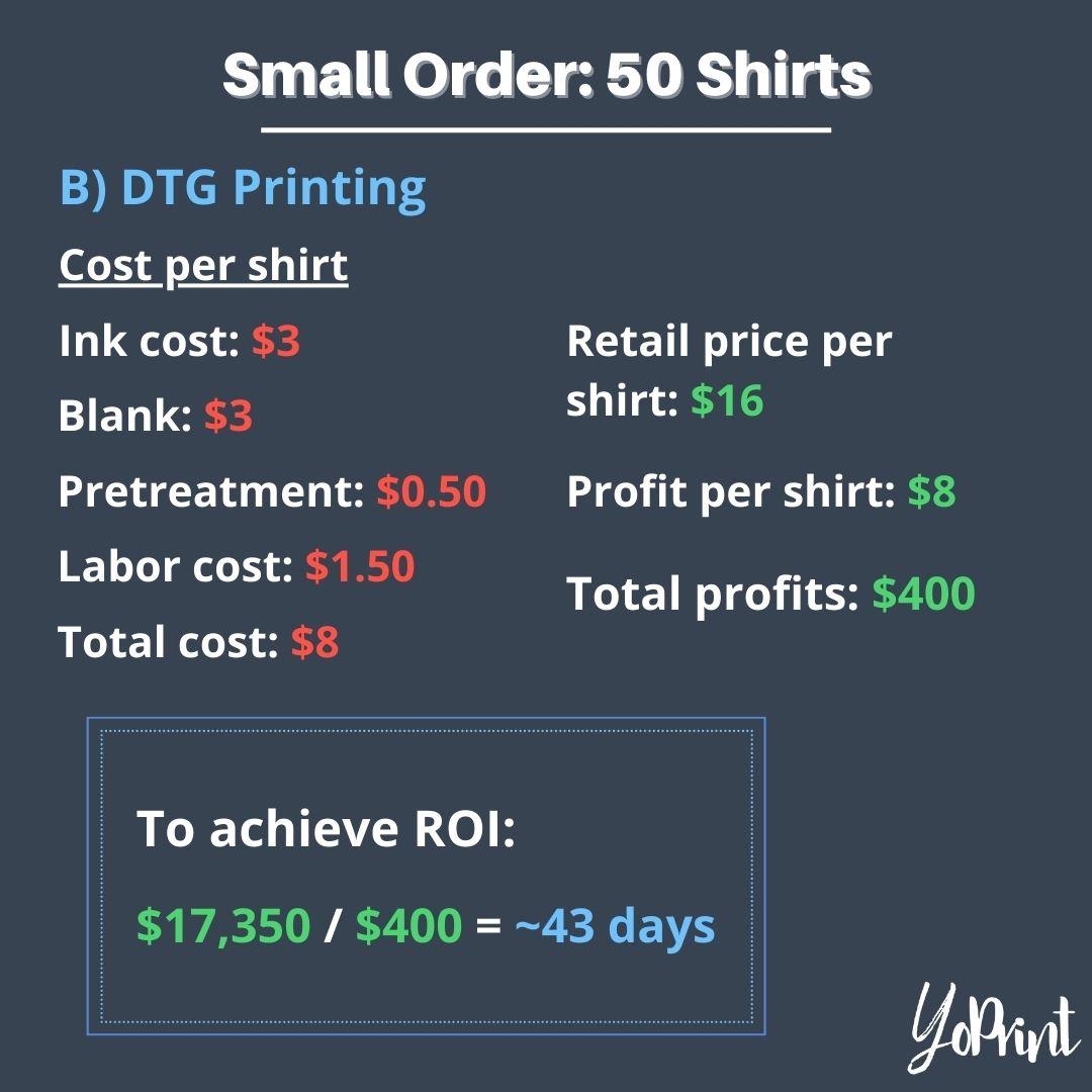 Now, let’s compare this to DTG printing. We’ll also use the $17,350 figure we got earlier to find your ROI, assuming you’re using that setup to conduct your DTG printing business.