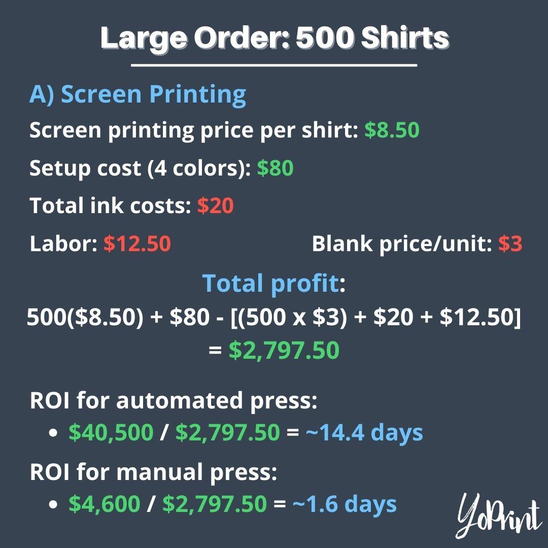Unless you have a good SOP and print management software, it’s much more practical (and cost-effective) for a screen printer to receive five large orders to achieve its ROI than 100 smaller orders.