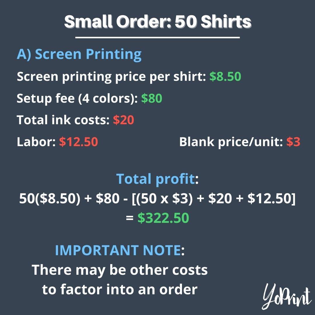 Now let’s compare the pricing for an order size of 50 shirts with 4 colors between DTG and screen printing. We’ll start with screen printing.