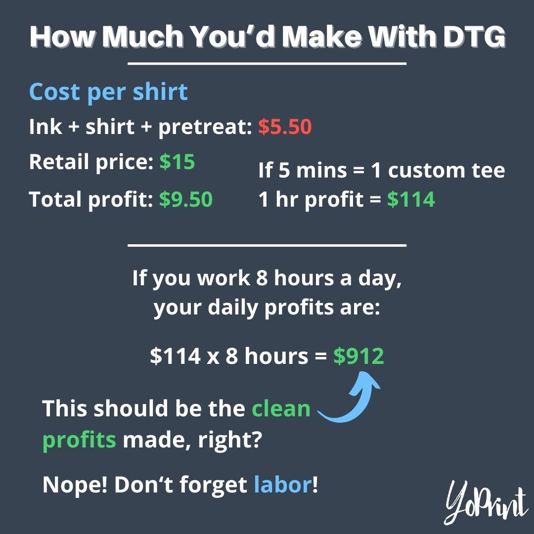 Assume that $17,350 is the total amount you invested in DTG equipment and consumables For DTG, the number of colors doesn’t affect the overall price, nor do you need to worry about a lengthy setup process, which makes it great for quickly printing complex artwork with varying colors. You can also see that screen printing is not as profitable as DTG for small-volume orders, especially with the lengthy setup process needed before you can start printing anything.