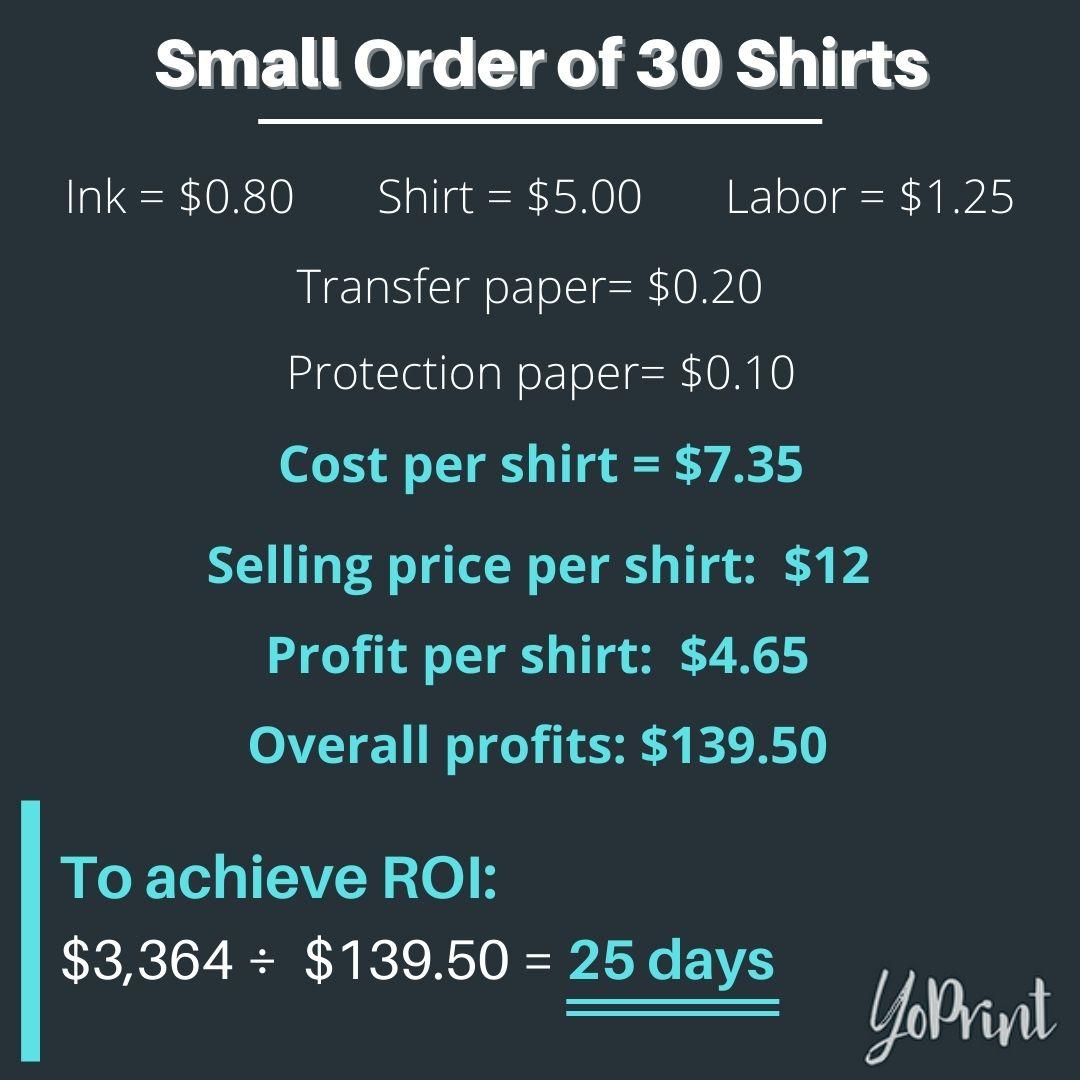 Your profits and losses depend on how you plan to run your printing business. Specifically, are you only printing small designs covering part of the shirt’s front? Are you doing all-over printing or cutting and sewing?