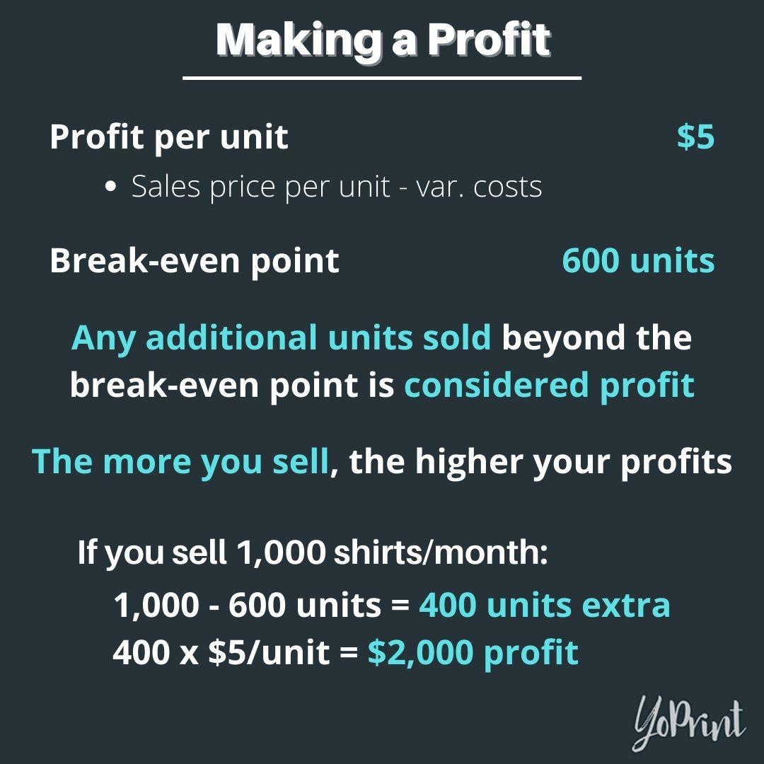 You’ll thus need to sell 600 custom garments (or $7,200) to break even. Selling more than that amount means you’ll be earning a profit. Thus, from that example, if you sold 1,000 units that month, you’ve made a profit from the additional 400 units sold (or $4,800).