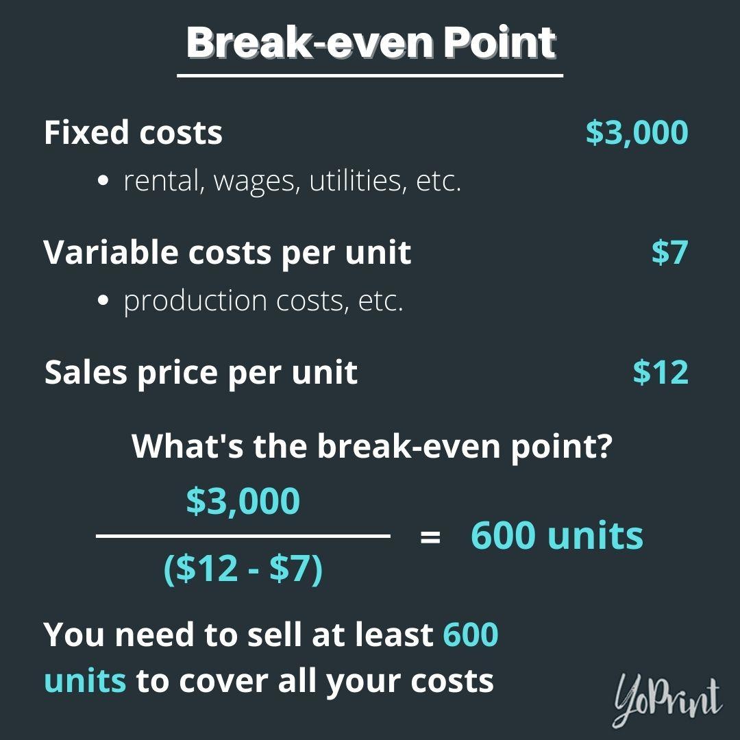 Simply put, the break-even point is where your total sales equal your overall expenses, a point where there is no profit or loss. In the context of your print shop, you’ll need to adjust your preparation, printing, and shipping costs so that the revenue generated from every sale eventually surpasses the break-even point. If it does, then you’re considered as operating at a profit; otherwise, you’re operating at a loss.