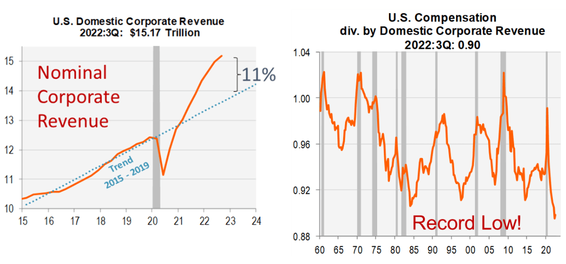 For now, corporate revenues have been greatly increased to above pre-Covid levels (about 11 percent, or $1.5 trillion) owing to “massive stimulus and inflation.” This resulted in driving compensation ratios (an analysis of an “employee’s compensation” compared to the “midpoint of the industry standard”) to “record lows.” With larger revenues, the compensation ratios remain low and, in turn, keep the job market strong. This benefits consumers by granting them substantial “real purchasing power,” which explains the significance of positive sales growth in January.