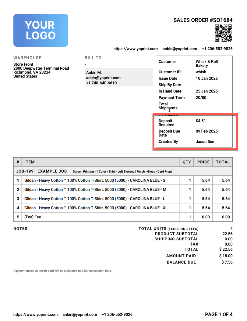Sales Order PDF: Added Missing Deposit & Created By Information