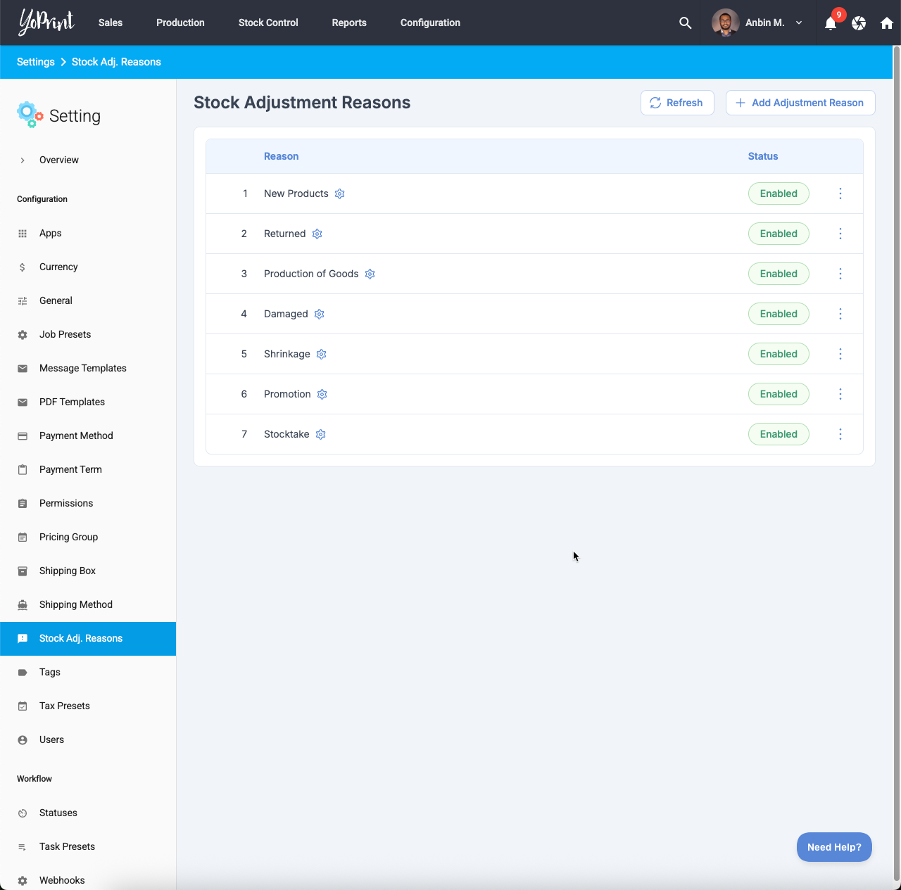 Settings: Stock Adjustment Reason Page Redesign