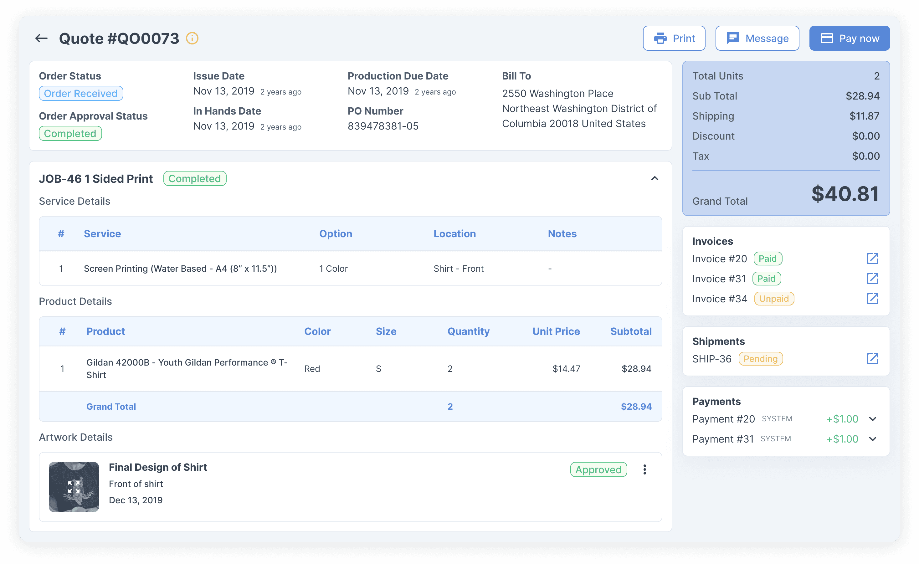 Quoting your customers has never been easier! YoPrint's Advanced Pricing Engine, Automatic Sales Tax Calculation, and garment costs pulled directly from popular vendors (like SanMar, AlphaBroder, and S&S Activewear) make quoting customers a breeze. Want to make Quoting even more efficient? Use Job Templates to prefill orders with single click! Close sales better and faster.