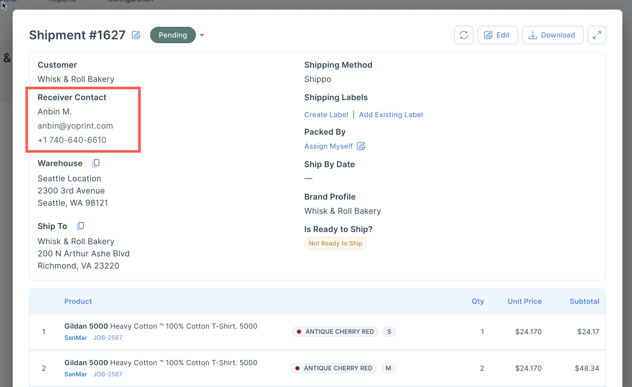 Receiver contact information is now visible in the Shipment Details view.