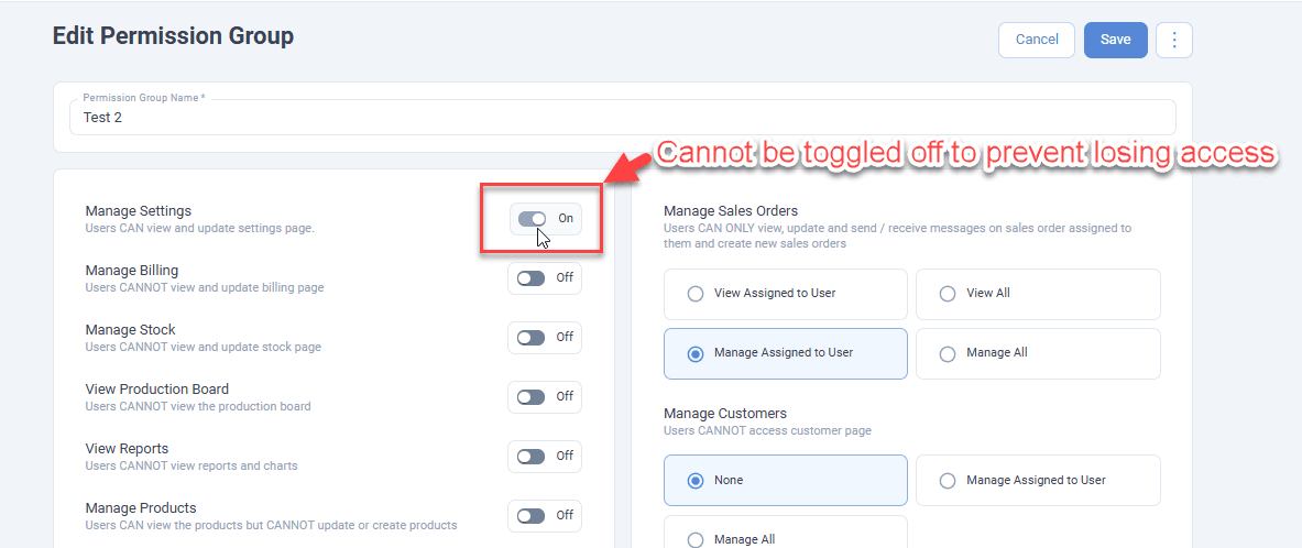 Users can now edit their own permission group while maintaining safeguards against disabling their own Manage Settings access.