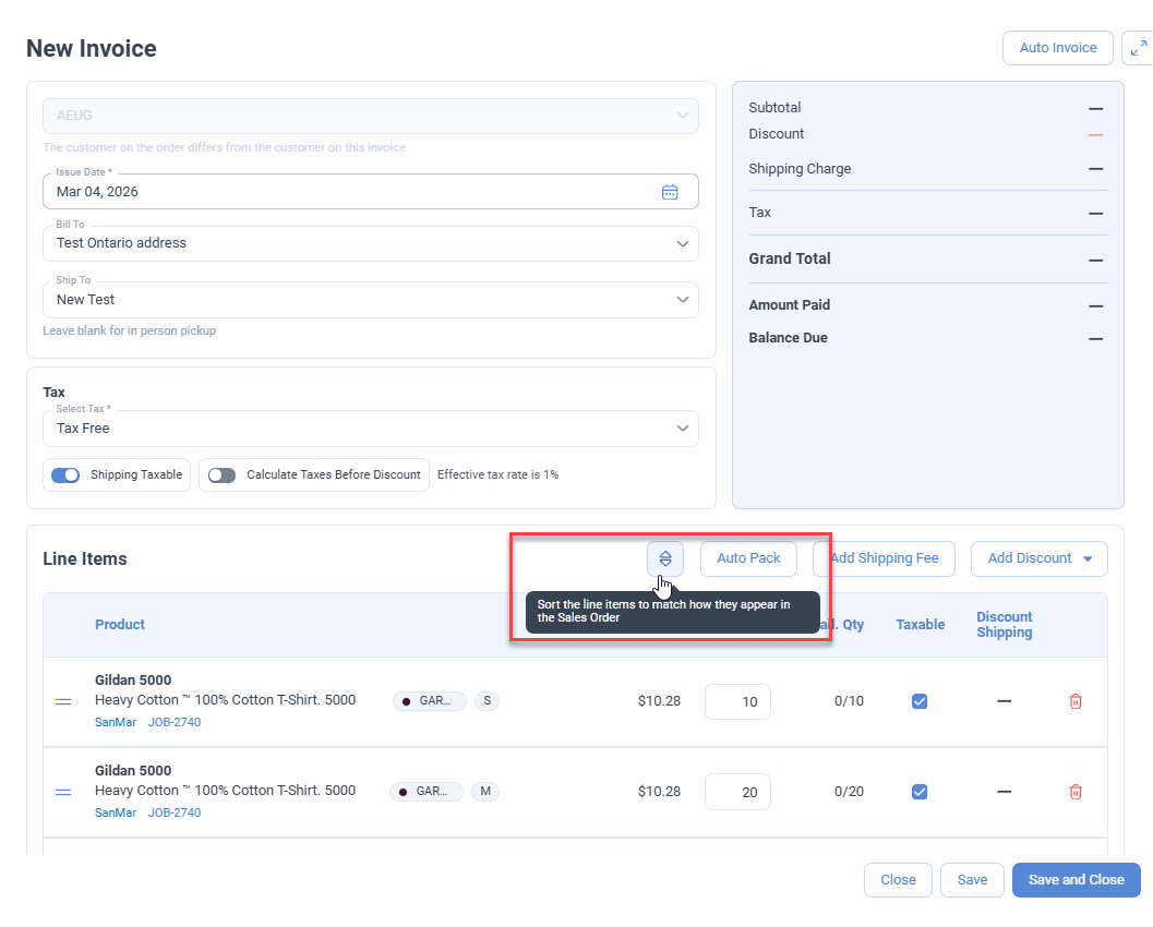 Added a sort button to organize invoice and shipment line items in the same order as the Sales Order.